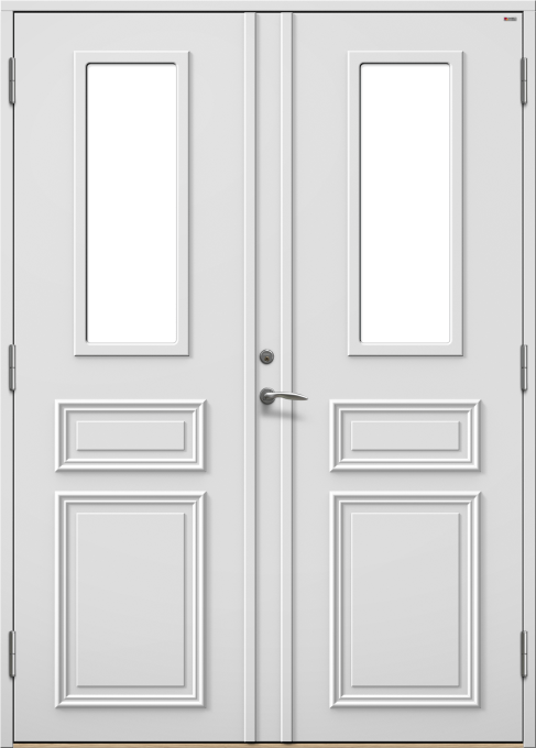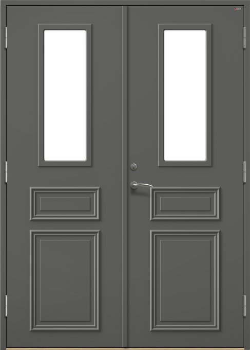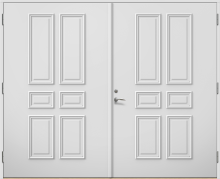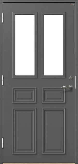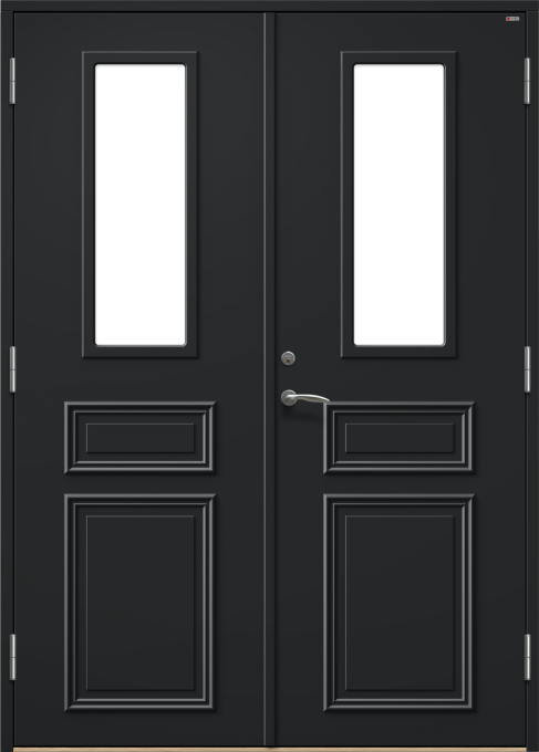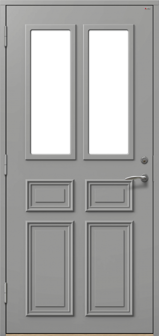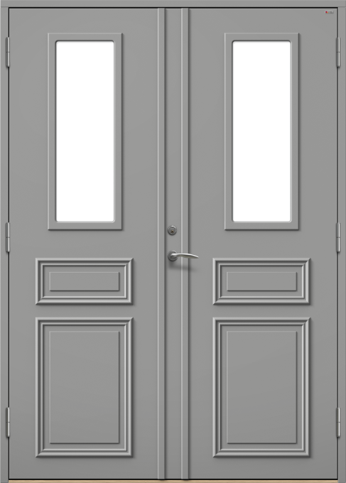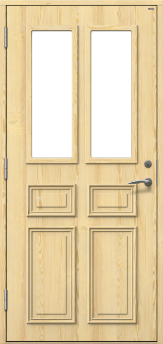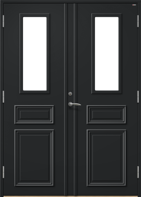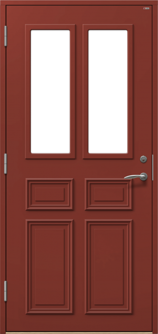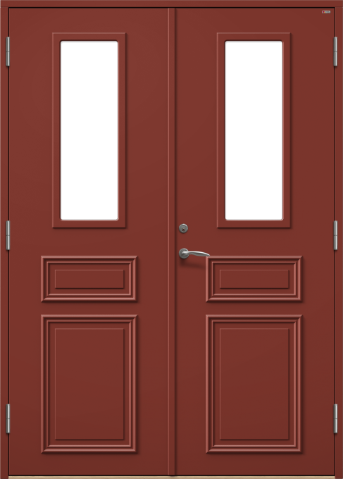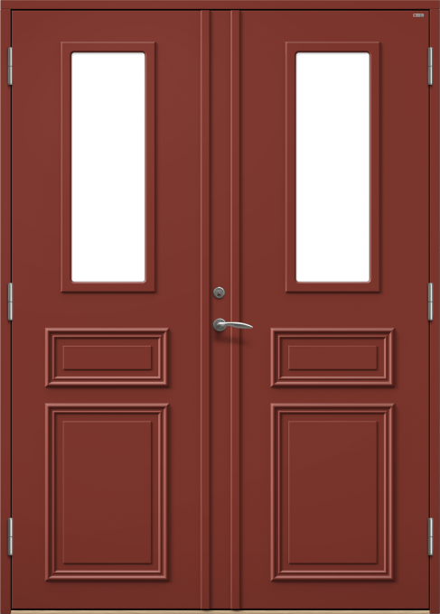 Ytterdörr med dekorramar och dekorplattor på utsidan. Klart glas är standard men du kan även välja klart, frostat eller rödfärgat. Vid pardörr med 2 speglar.