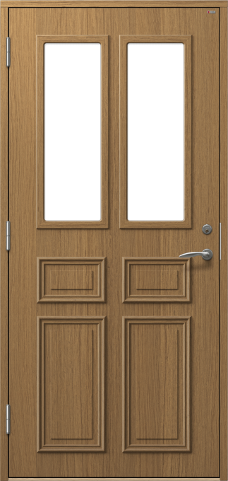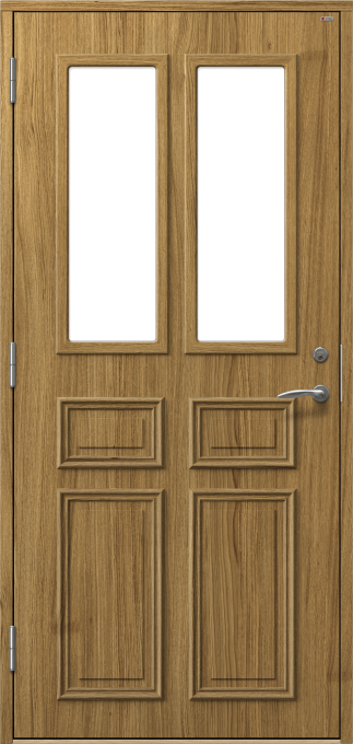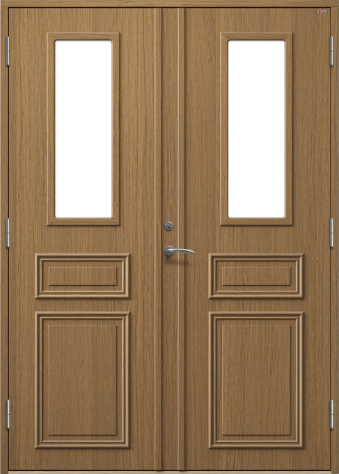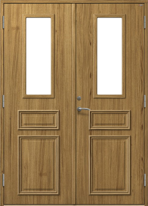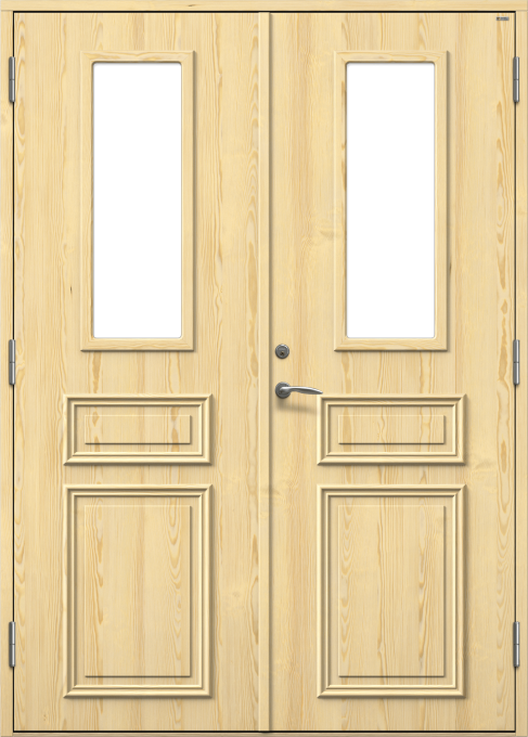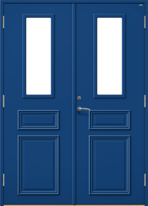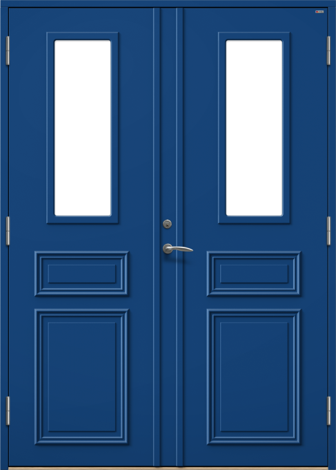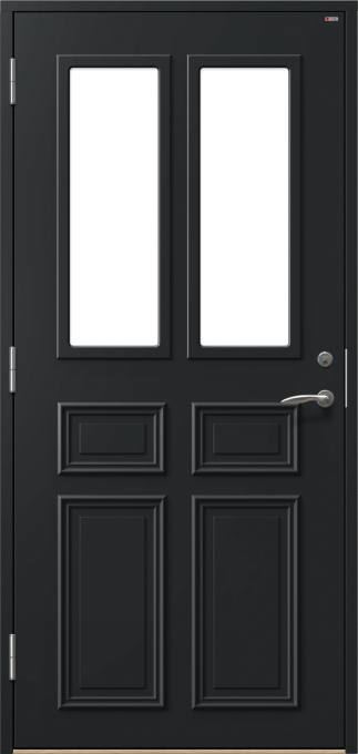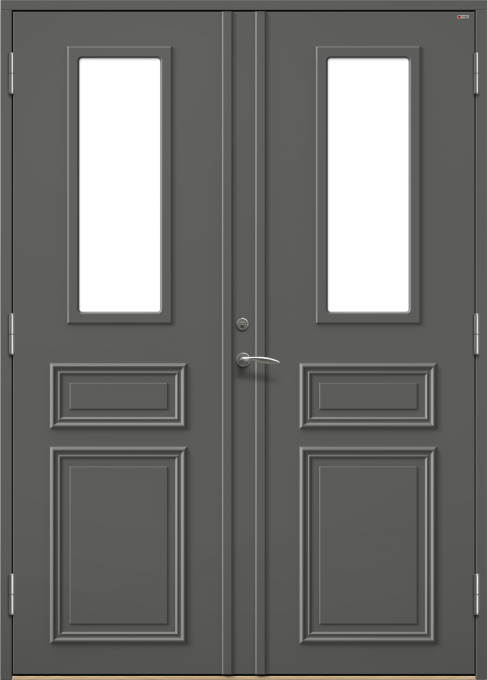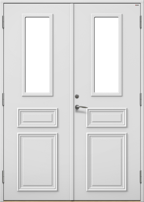 Ytterdörr med dekorramar och dekorplattor på utsidan. Klart glas är standard men du kan även välja klart, frostat eller rödfärgat. Vid pardörr med 2 speglar.