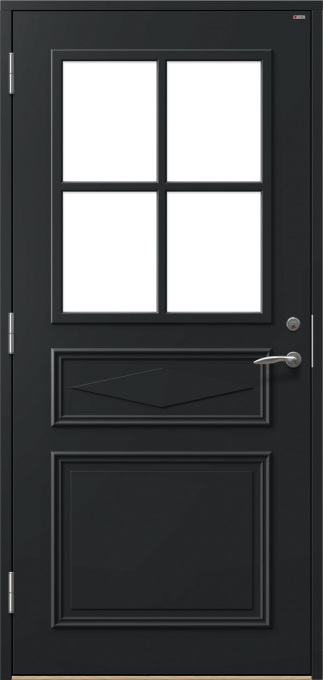 Delsbo 7801 är en vacker ytterdörr med dekorplattor på utsidan och glas. Finns i ek, teak och furu, samt målad i valfri NCS-kulör.