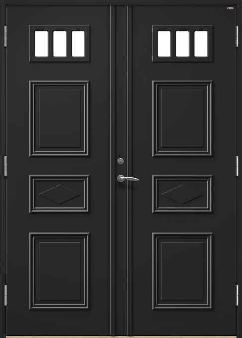 Delsbo 7804 är en vacker ytterdörr med dekorplattor på utsidan och glas. Finns i ek, teak och furu, samt målad i valfri NCS-kulör.