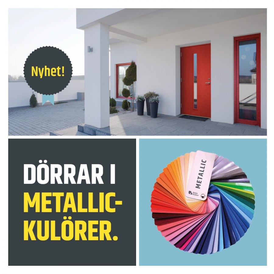 Vi går ett steg längre och erbjuder även dörrar i metallic-kulörer. Enhetligt, snyggt och matchande till aluminiumfönster eller om du bara vill att din entré ska få extra uppmärksamhet. Kontakta oss så berättar vi vilka metallicfärger som vi nu erbjuder.