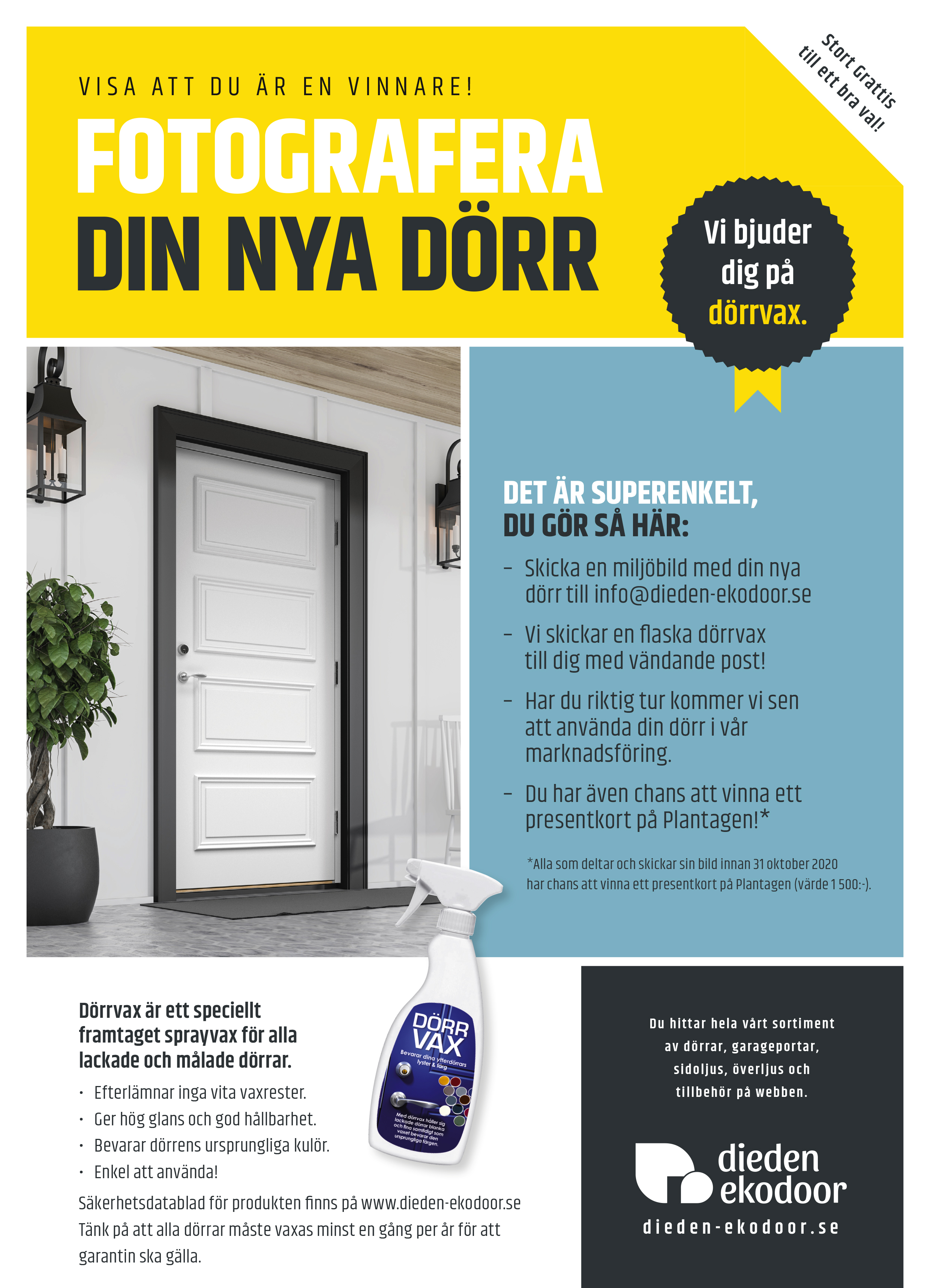 Nu kan du få en flaska dörrvax av oss om du skickar in en miljöbild på din nya dörr från Dieden-Ekodoor.