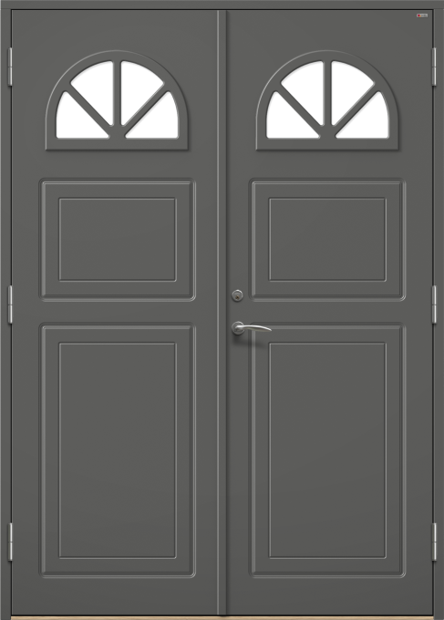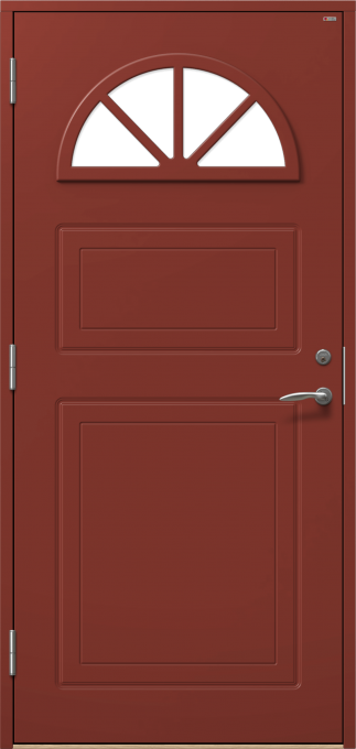 Dörr med frästa detaljer och halvmåneformat fönster med spröjs.