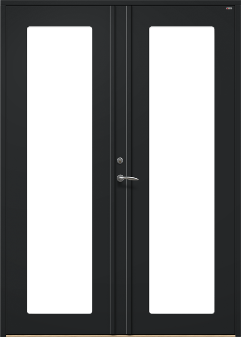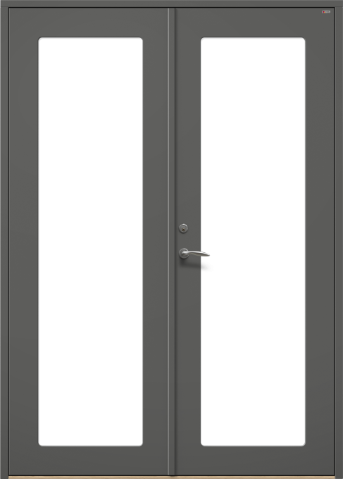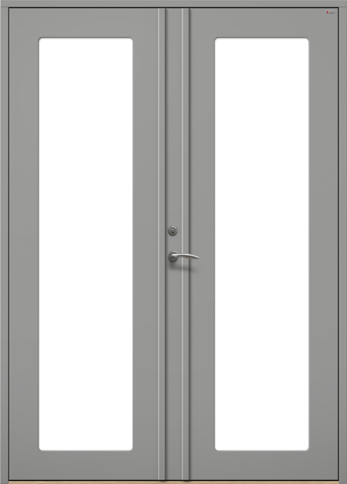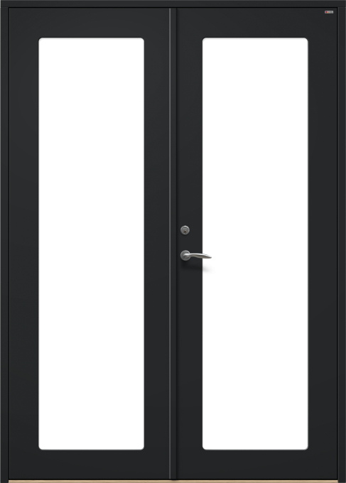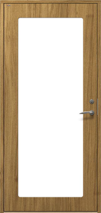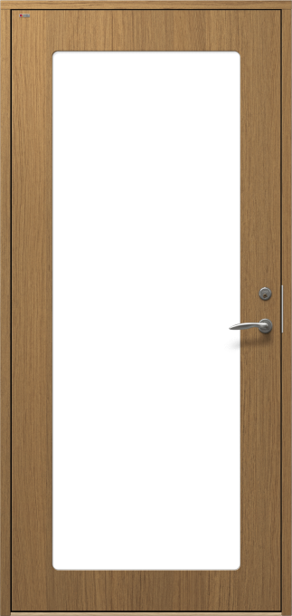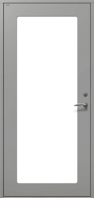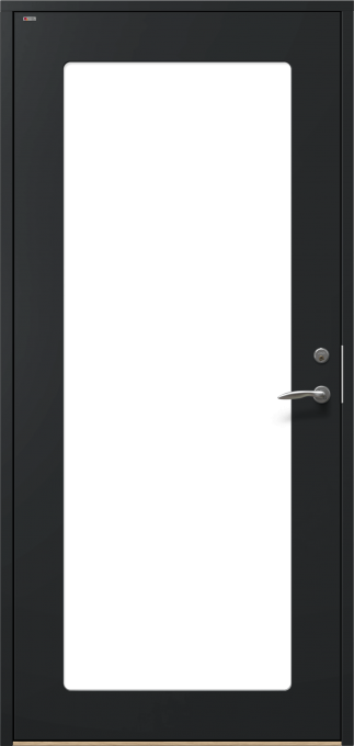 Ytterdörr i slät design, med dolda gångjärn och utsida utan utanpåliggande glaslist.