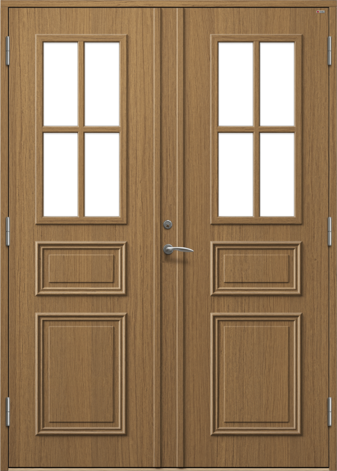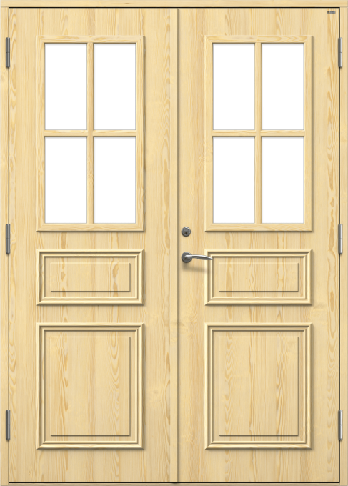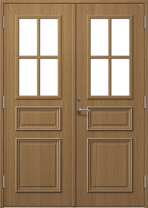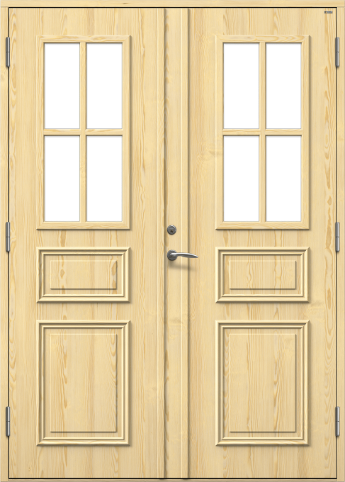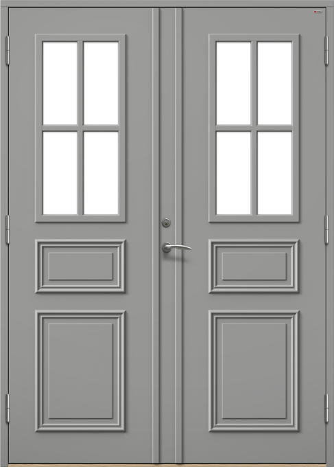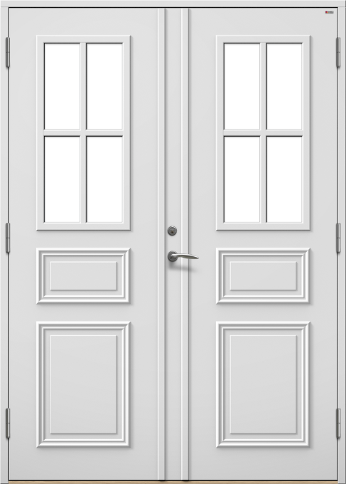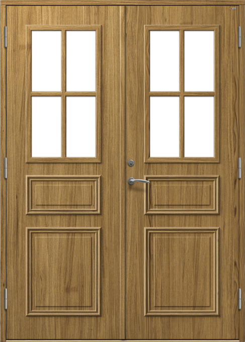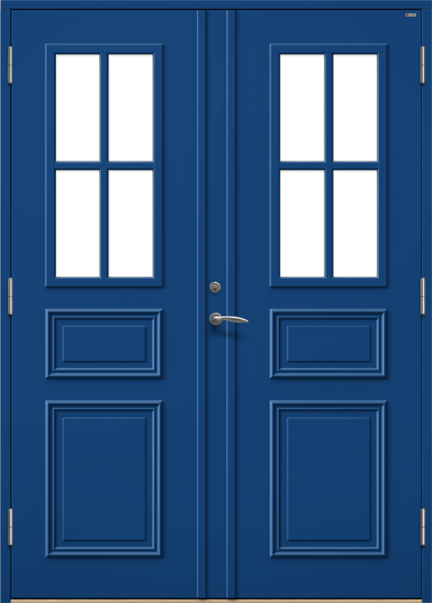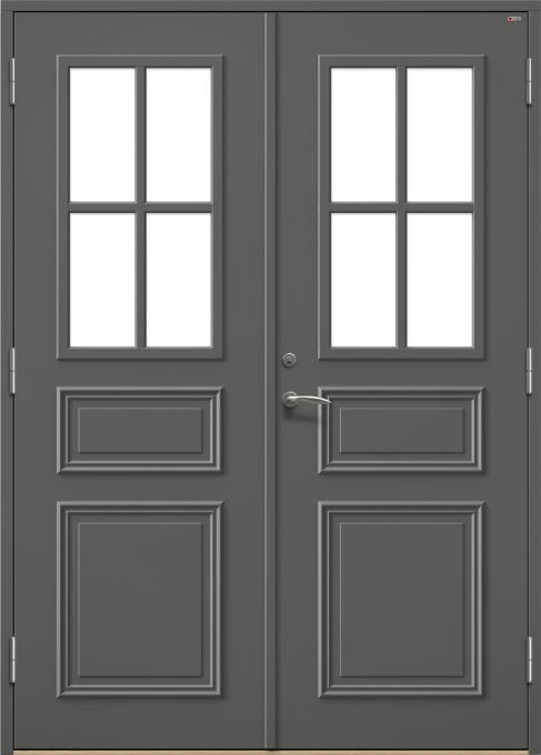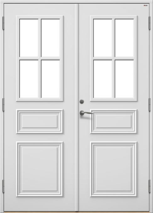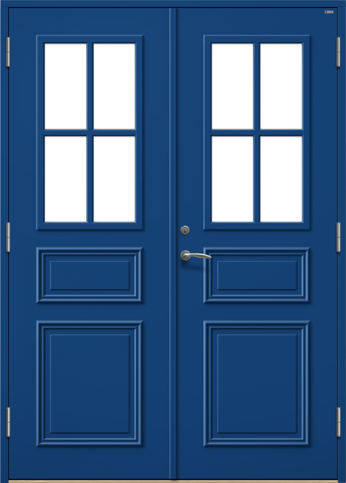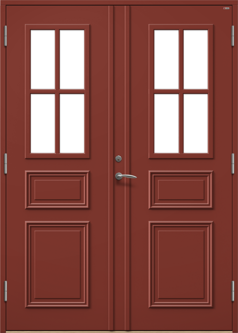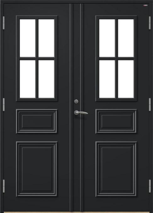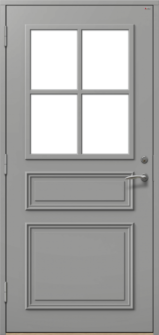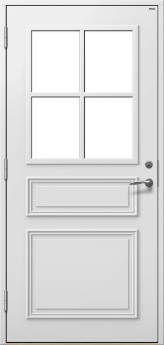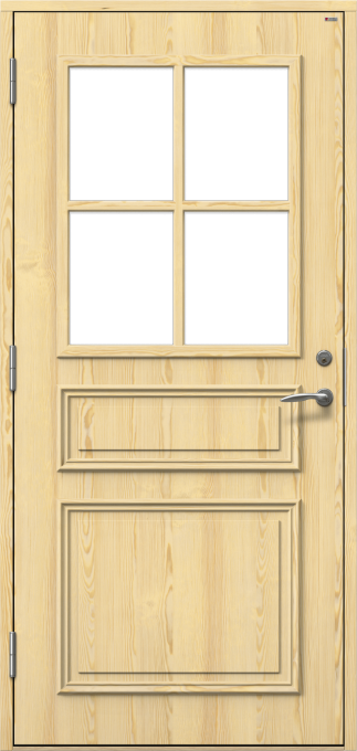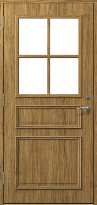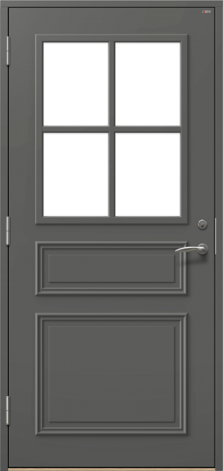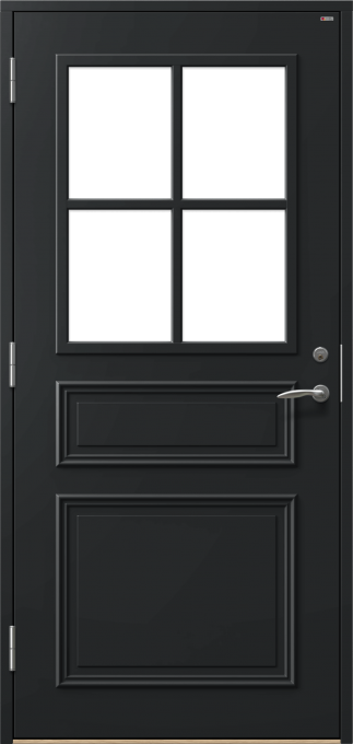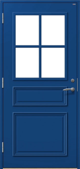 Ytterdörr med dekorramar och dekorplattor på utsidan.