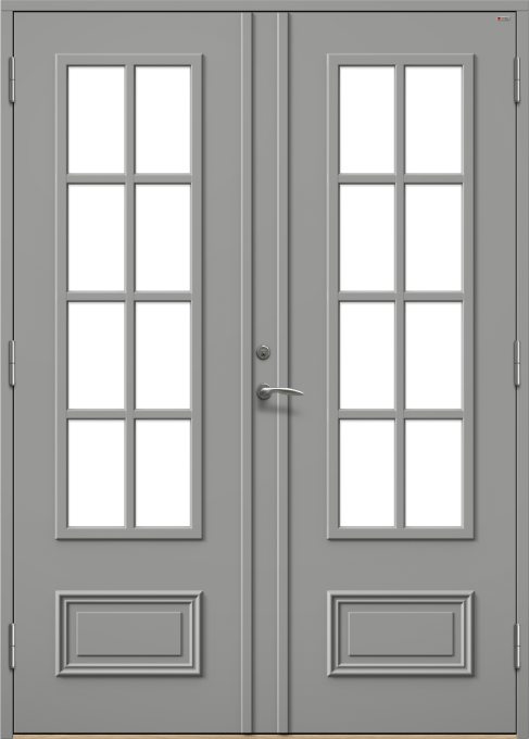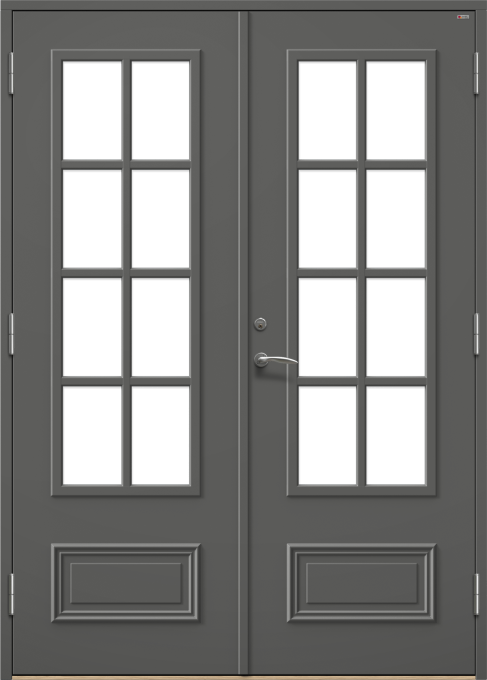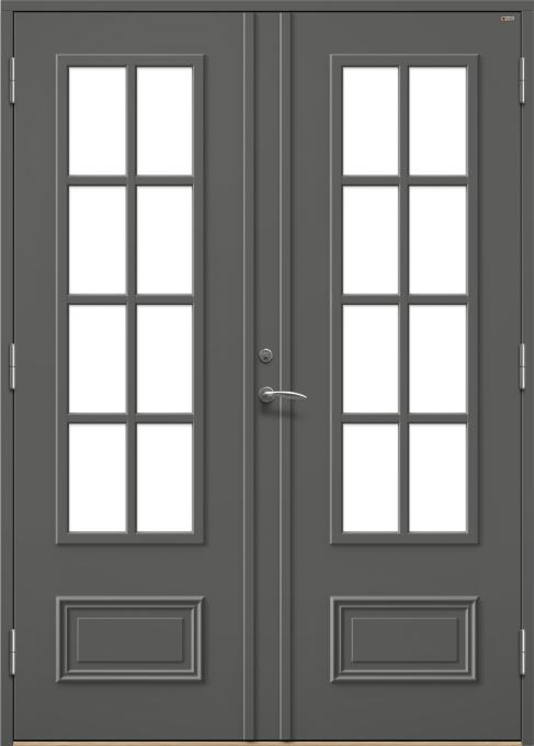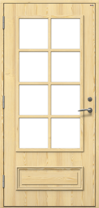 Ytterdörr med dekorramar och dekorplattor på utsidan.